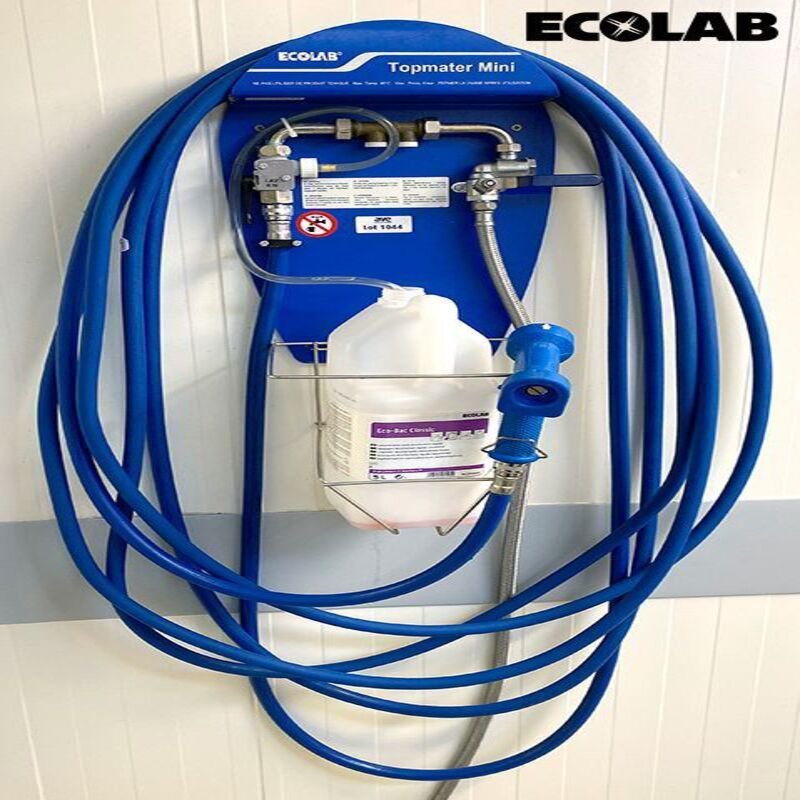 Une unité centrale d’hygiène murale,muni d’un long tuyau et pistolet pour le nettoyage et le rinçage en pulvérisation du matériels et des surfaces de production dans les industries agroalimentaires.